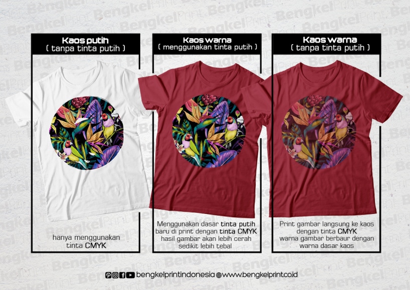 “Bagaimana jika tidak menggunakan tinta putih sebagai alas ?” tidak jadi masalah, namun jangan salahkan jika hasil sablon kaos nya nanti kurang maksimal, karena tinta textile DTG warna CMYK nya terlihat pudar / kurang tajam. Berbeda lagi, jika anda sablon kaos warna putih, tidak masalah tidak menggunakan dasaran tinta putih, karena kaos tersebut sudah berwarna putih sehingga anda sudah bisa melakukan print kaos dengan warna CMYK. Namun bila anda memberikan dasaran tinta putih juga akan lebih baik lagi.