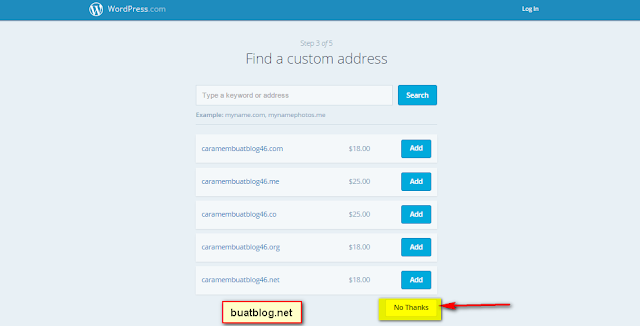 Klik Next Step untuk melanjutkan. Pada tahap ini Anda akan di beri referensi atau pilihat alamat blog berbayar dengan menghilangkan subdomainwordpress.com menjadi alamatbloganda.com. Jika Anda tidak tertarik dan tetap memilih blog gratis, klik pada No, Thanks untuk melewatinya. Lihat gambar;