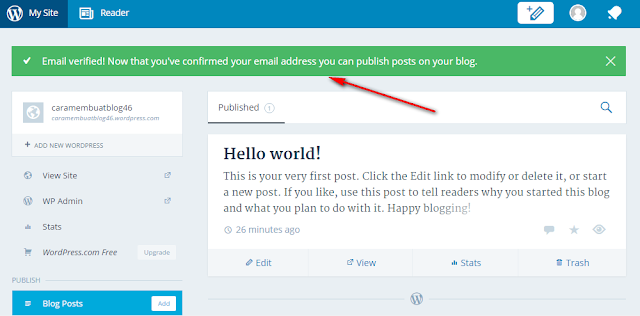 Pada tahap ini Anda sudah selesai dalam membuat blog di wordpress, sekarang saatnya memverifikasi akun Anda. Masuk ke email Anda, pastikan wordpress sudah mengirimi email aktivasi akun Anda. Jika belum kirim ulang email Anda dengan cara klik Re-send your activation email atau ganti alamat email Anda dengan cara klik pada change the email address your account. Lihat gambar;