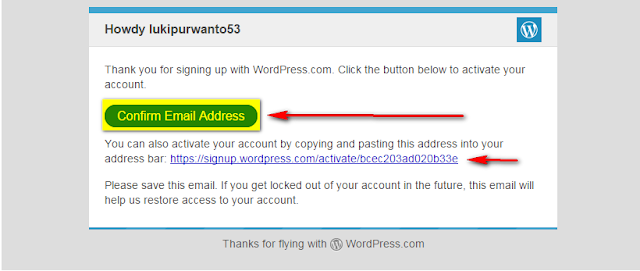 Setelah mendapatkan email dari WordPress silahkan klik pada Confirm Email Address atau klik pada link di bawahnya juga bisa. Lihat gambar;