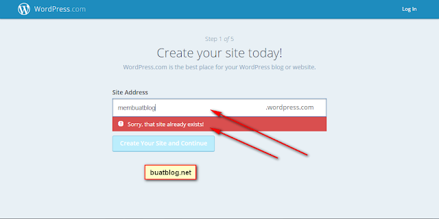 Dan pastikan nama alamat blog yang Anda pilih masih tersedia, jika tidak silahkan cari lagi hingga alamat blog tersedia. Nah jika sudah tersedia silahkan klik pada Create Your Site And Continue. Contoh gambar di atas menunjukkan alamat blog tidak tersedia dan contoh gambar dibawah ini adalah alamat blog yang tersedia.
