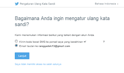 3. Selanjutnya pilih Email tautan ke email Anda, namun jika Anda memasukkan nomer hp pilih pada Kirim kode lewat sms ke nomerhp Anda dan klik pada Lanjutkan.