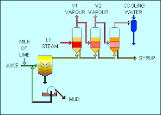 Setelah mengalami proses liming, proses evaporasi dilakukan untuk mengentalkan jus menjadi sirup dengan cara menguapkan air menggunakan uap panas (steam). Terkadang sirup dibersihkan lagi tetapi lebih sering langsung menuju ke tahap pembuatan kristal tanpa adanya pembersihan lagi.