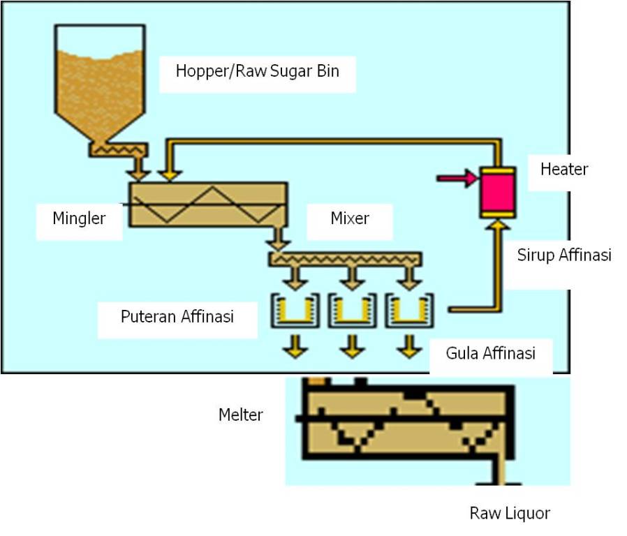 Tahap pertama pemurnian gula yang masih kasar adalah pelunakan dan pembersihan lapisan cairan induk yang melapisi permukaan kristal dengan proses yang dinamakan dengan “afinasi”. Gula kasar dicampur dengan sirup kental (konsentrat) hangat dengan kemurnian sedikit lebih tinggi dibandingkan lapisan sirup sehingga tidak akan melarutkan kristal, tetapi hanya sekeliling cairan (coklat). Campuran hasil (‘magma’) di-sentrifugasi untuk memisahkan kristal dari sirup sehingga kotoran dapat dipisahkan dari gula dan dihasilkan kristal yang siap untuk dilarutkan sebelum proses karbonatasi.