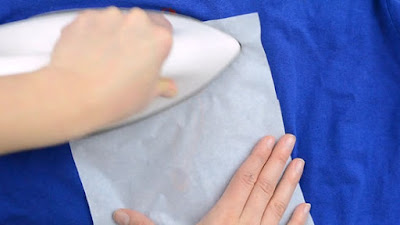 Lalu tahan dan tekan setrika diatas kaos jangan di gosok-gosok, lakukan selama 15-20 detik untuk setiap bagian yang disetrika, dan ulangi ke bagian lainnya sehingga semua bagian terkena panas.